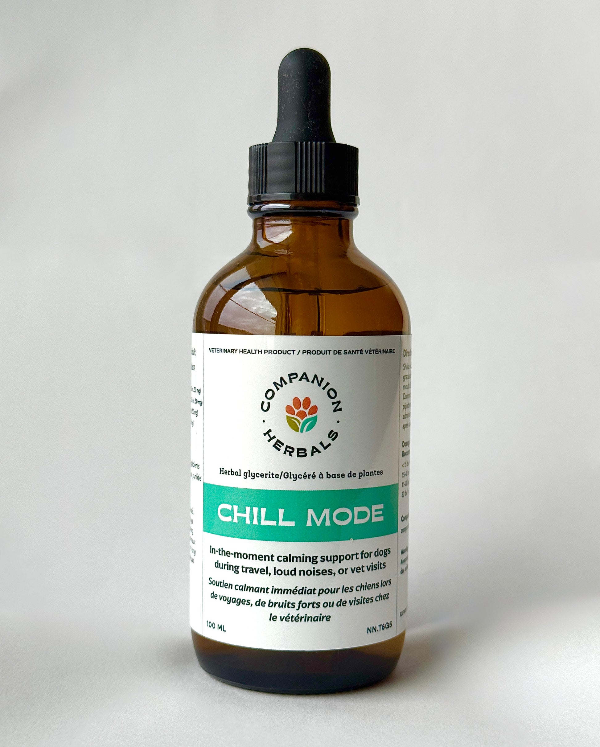 Chill Mode is for as needed instant ease. Fast-acting herbal support for fireworks, vet visits, car rides, grooming appointments, plane rides, or any moment your dog needs quick emotional ease.